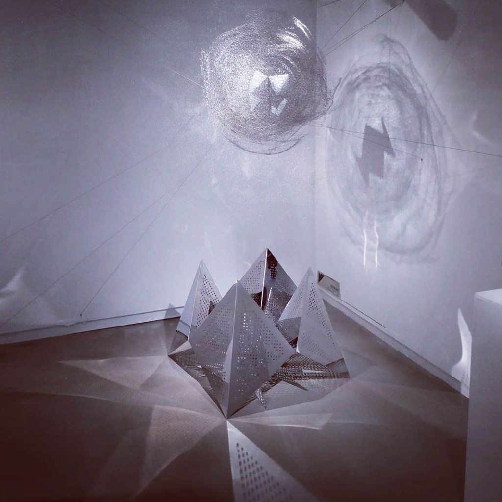 乍步入展館不難看見一片金屬的輝影,唯我卻繞道而走,剛好錯過了。離館之際,方才遇上,卻是我最喜歡的一作。下者剛硬明亮,上者輕柔透光,在燈光映照下更見鮮明對比。憶起童時在東南西北八個小角寫下文字,明明可以占卜一番;細思之下,既然八角的未來都是自己寫下的,所謂的未來,自己不是早已明瞭。