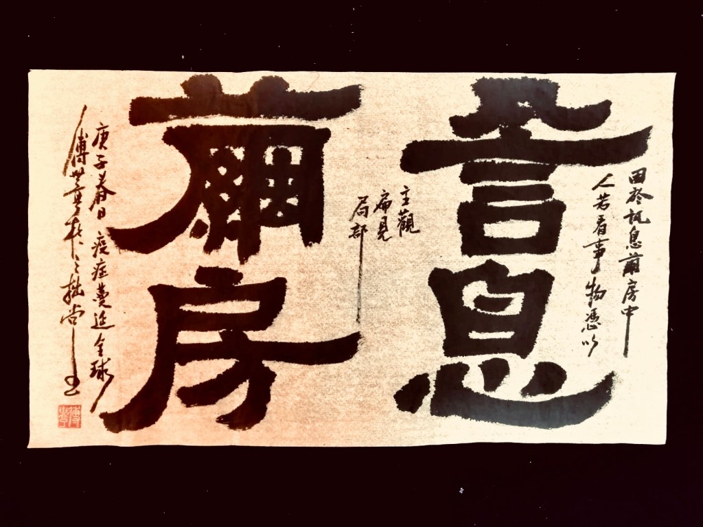 兵荒馬亂的疫情之下,老師為我們題下的四字是信息繭房。當然老師有不少作品亦祈求疫情盡快完結,但信息繭房談的是人在處亂世的心景和態度,紛亂之世若存我執,結局只是困身於繭房之中。傅先生亦向我介紹了多件疫情有關的作品,能創作時亦不忘社稷之憂,實有古之文人的風骨。