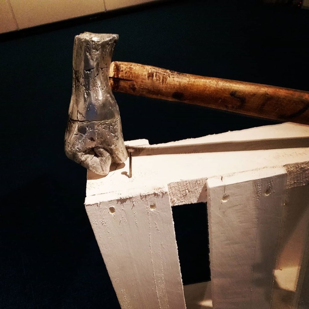關於浸大同學不妨介紹兩件有趣的裝置。周芷瑤的《本相》也是簡單直接的想法,直接的還原工具作為身體延伸的特性,不過當全套的工具羅列在桌上時還是有點可愛,其中的鑽頭、鎚子、耳筒尤其令人注目。