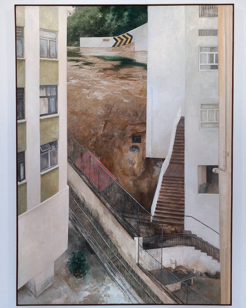 工廈中的刺點畫廊是中環畫廊望塵莫及的大,展出多幅大畫仍是綽綽有餘。轉過清雅的主題牆便是兩幅《玻璃窗》的炫技之作,東龍前輩其中一樣令人深刻的地方是每一粒瓷磚都會去細畫,親眼目睹更是震撼,恐怕一幅畫畫一年之說是所言非虛。事實上展覽中很多畫作都存在瓷磚的元素,分別去看會發現處處各有不同。