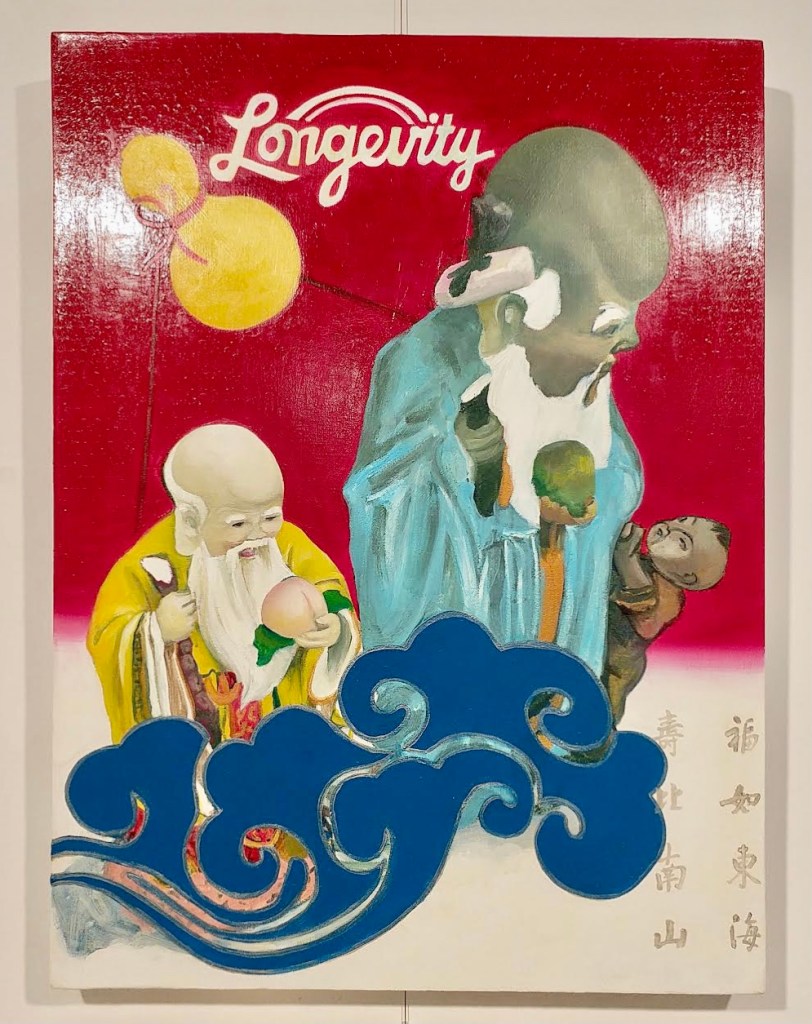 王棠的《壽星公》明顯指向的是壽星公煉奶,某情某景正是金寶湯的故技;但作品並沒有這樣就結束,紅袍壽星公換了一身黃藍才是作品的開始。考了個究,原來早期壽星公的品牌是由香港商人為代理荷蘭煉奶所創,後將事業移至越南,沿用的是黃衣老人的形象。又有幾版煉包裝上亦有小兒作伴,雖然藍衣老人未能尋得其出處,但小兒作伴一點上仍有承襲。至於手抱之物又是何果?頭後又是何物?看似簡單的作品實是越看越懸疑。