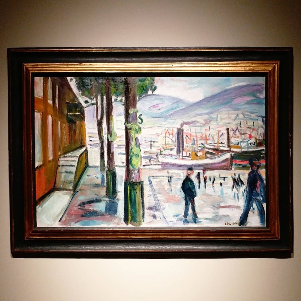 莫奈、梵高在港還是偶有個別展出,但上一次在香港看見孟克已是不知何時。對他略有認識的朋友必定會知道名作《吶喊》,再熟悉一點會知道完整的《生命的緞帶》系列;不過及後的挪威風景也許更能突顯其表現主義的特質,例如奧斯陸大學禮堂的壁畫《太陽》散發的是更強的自然力量。而此幅《卑爾根港口》不禁要望向右上的山麓靜靜地翻動著,前景則是平靜的港口景色,感覺是釋懷不少。
