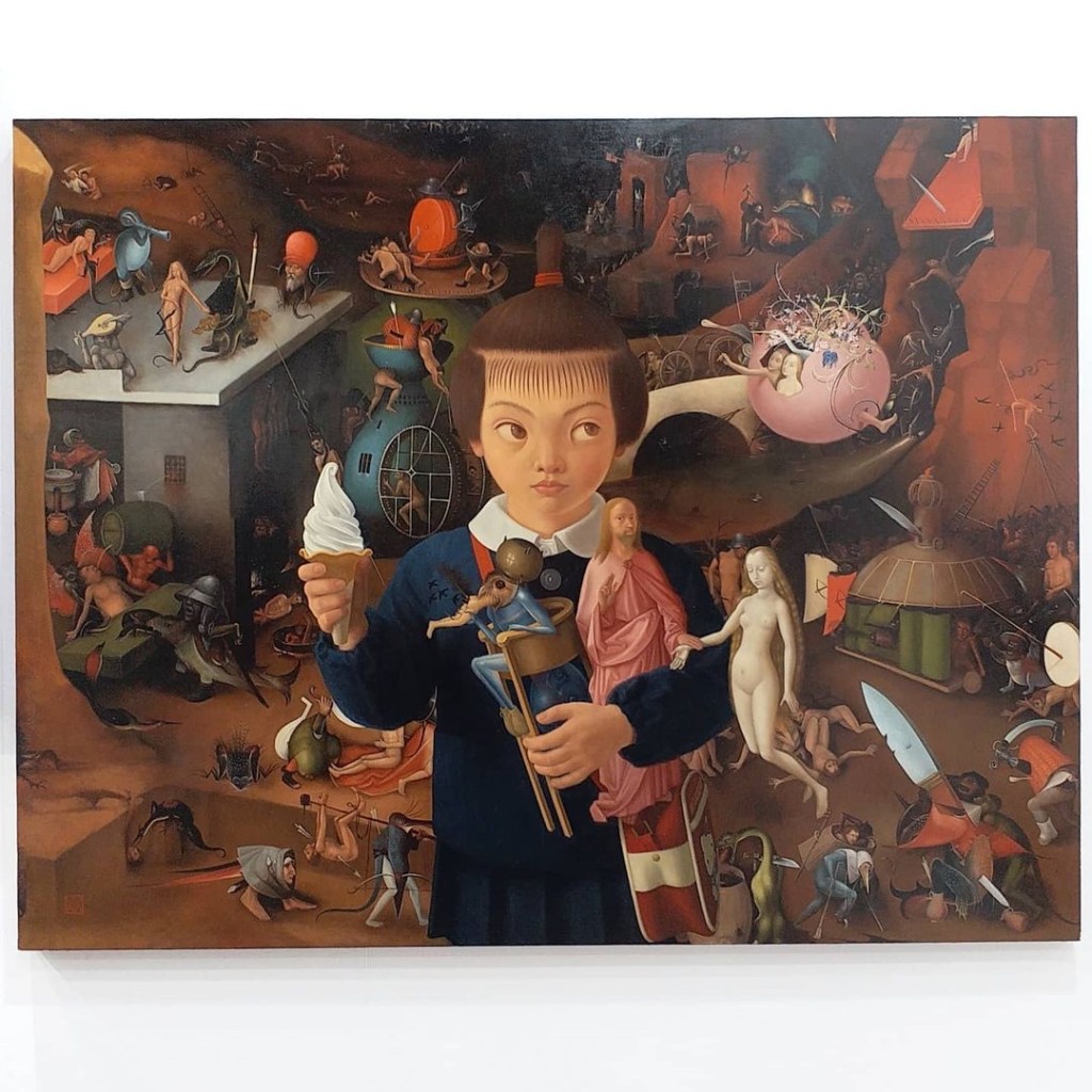 除了這幅波希《最後的審判》,還有一系列的作品例如巴別塔等等。波希的作品本身已經是玩味十足,追源溯始可以說是超現實之父。渡部滿把各名畫視為半現實的公眾空間,透過自己的女兒奈緒子界入不同的世界。這種類兒童的眼光即使在恐怖的世界之中,神色仍然自若;又沒有P圖式的格格不入,同令觀眾重新思考這一些名作。
