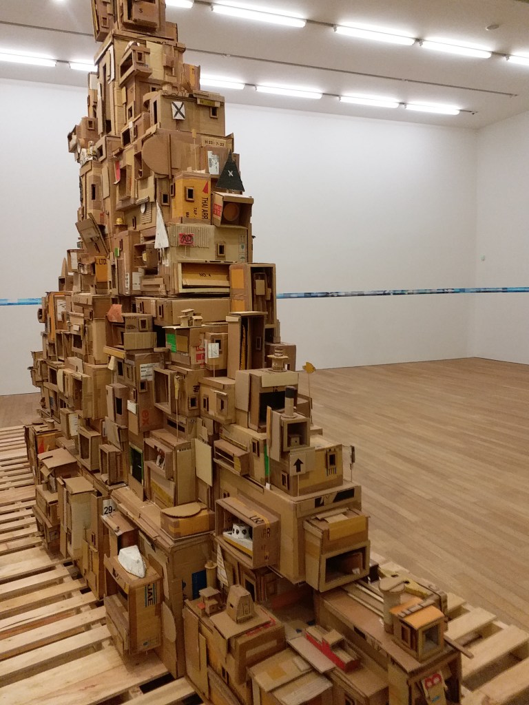 展廳稍前不遠是《經過III:另外一個國家計劃》,「誰的什麼」中的身份又似乎那麼的重要起來。船艦,或是屋舍,拔地而起三米之高,遙對牆上不一的海平面起航。為什麼身份重要?從字面的意思上,若沒有那個身份,事實上也沒資格繼承那個遺產。而在這作品的內涵之中可能船倉或是牆上的圖片都是他人甚至匿名者所給予的,而且岌岌可危的外觀反映了藝術家本人對移民的看法。