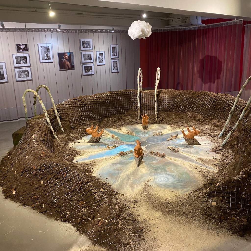 簾幕之隔,在展覽的中心是金正憲的《透過你的靈魂成為多位一體》,場中展出的是經過這次展題的變奏版本,原作在鹿特丹展出時是一個完整的圓形保護牆,邀請參觀者在其中進行冥想,感受萬物與心靈的歸一;波利相信決堤的改動是心靈面對困境的反映,同時作為此展的過渡角色,同樣表現出受創至到內在和解的過渡狀態。