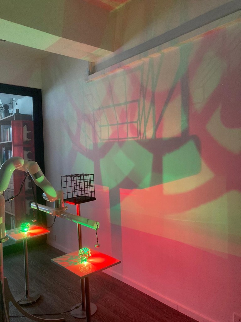 作品二而更是對數學史的重大回顧,在幾何學中其中一個最重要的一步便是歐幾里德幾何過渡到非歐幾何,機械臂加上球體與光影,只花數秒便穿越了千年的時間。